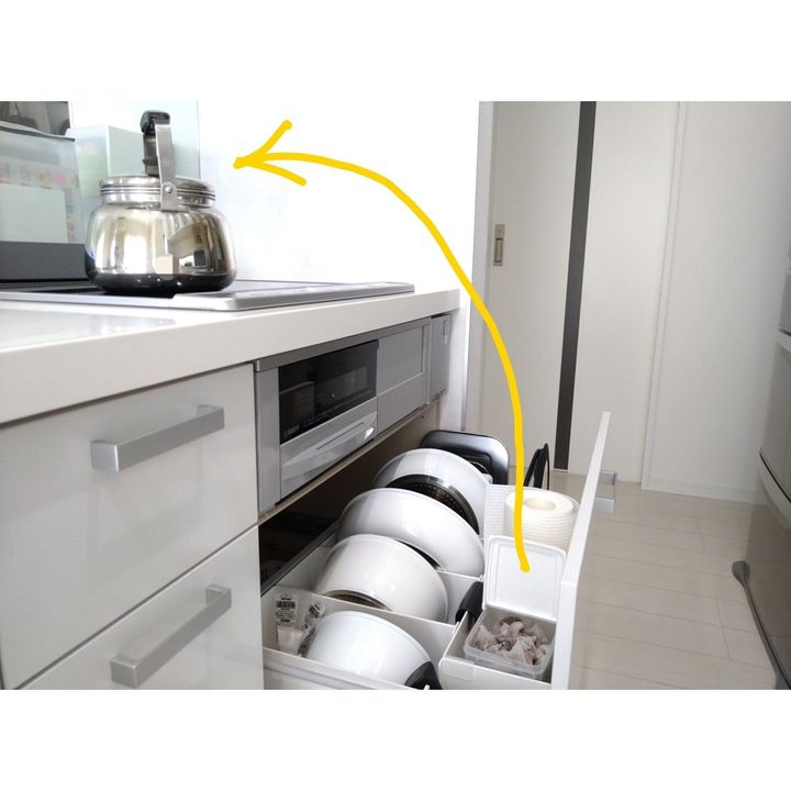 もともとはコーヒーや紅茶セットを置いているカップボードに収納していました。振り向いてカップボードの扉を開ける動線よりコンロ下なら少し引き出してポンとヤカンに入れるだけ。