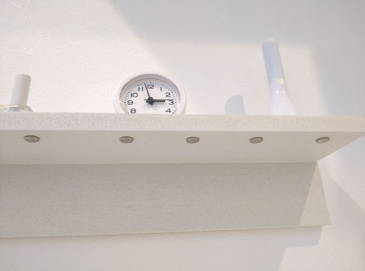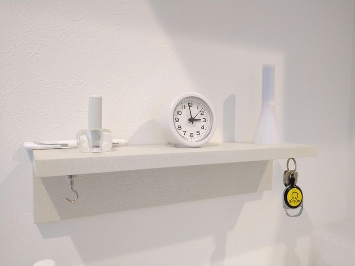 下駄箱上の壁面に無印良品の「壁に付けられる家具・棚」を取り付けて、鍵を置くというより鍵を浮かせた「空中収納」にしました。玄関にあると便利な印鑑、ボールペン、時計、懐中電灯も置いています。