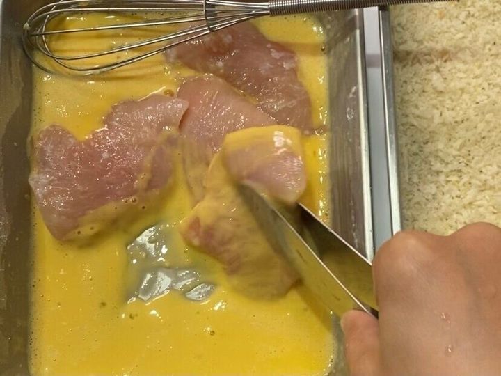 また、パン粉をつけたお肉を油の入ったフライパンに入れる時に