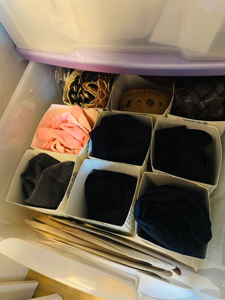 牛乳パックを同じ高さにカットして並べれば、靴下やベルトを入れるのにピッタリな収納になります。