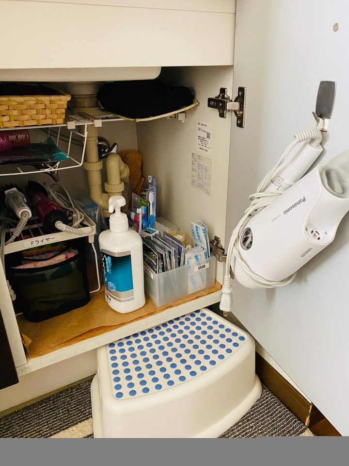 我が家の洗面所のシンクの下には開き戸の収納があるので、その扉の裏に強力粘着のフックを装着して収納しています。