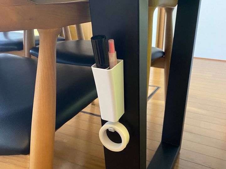 その時々で使う物はその度にいちいち取り出していたら面倒なので、よく使うペンやハサミ、マスキングテープやのりなどはダイニングテーブルの脚にマグネットでくっつけています。