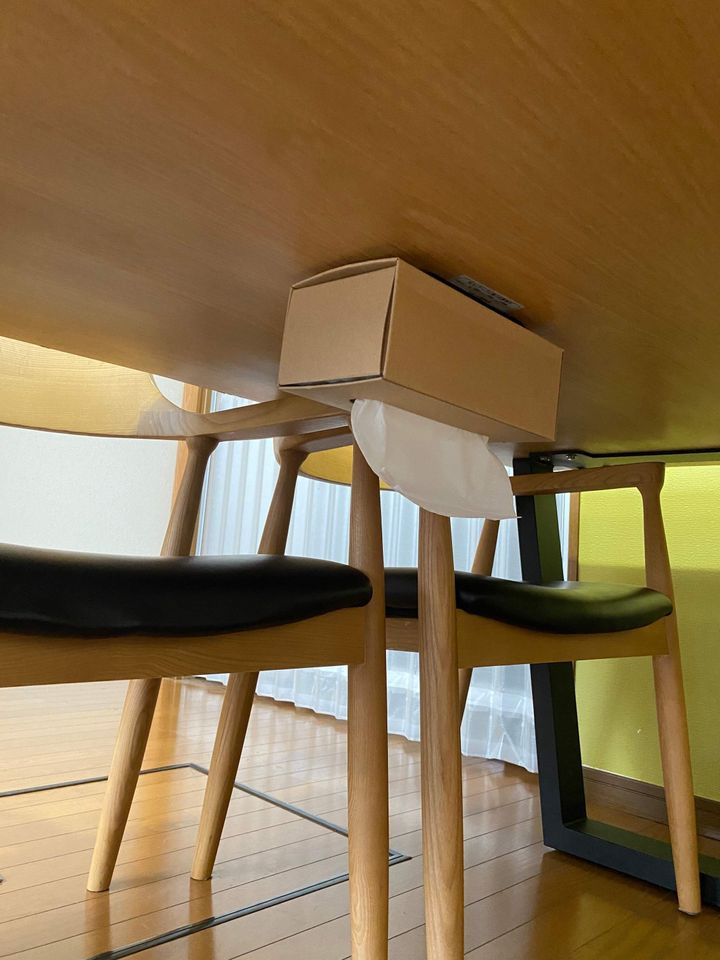 ティッシュはテーブル裏にさかさま収納すれば使いたいときだけ使える。
