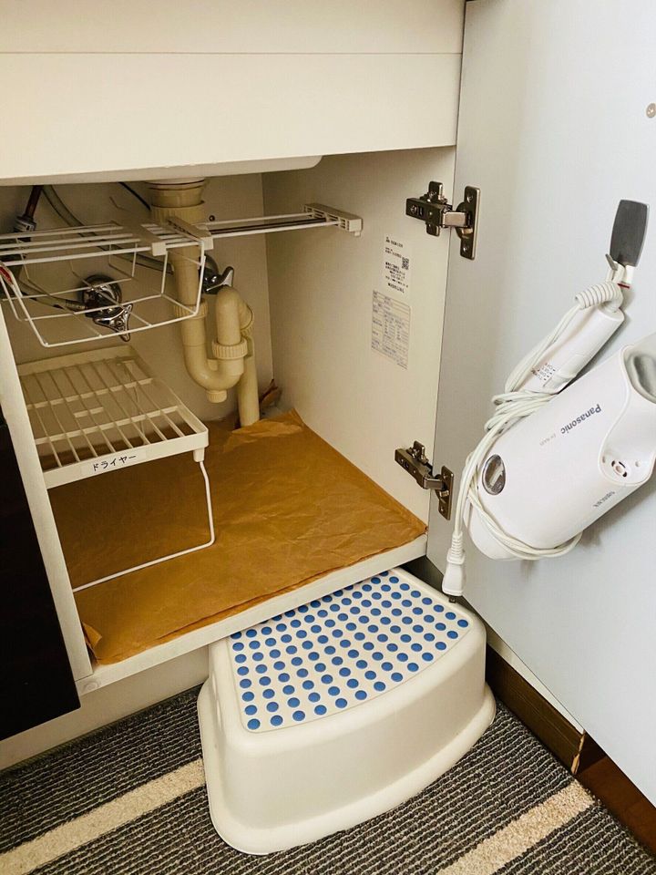配管があって収納の難しい洗面台の下でも省スペースで棚が出来上がり!