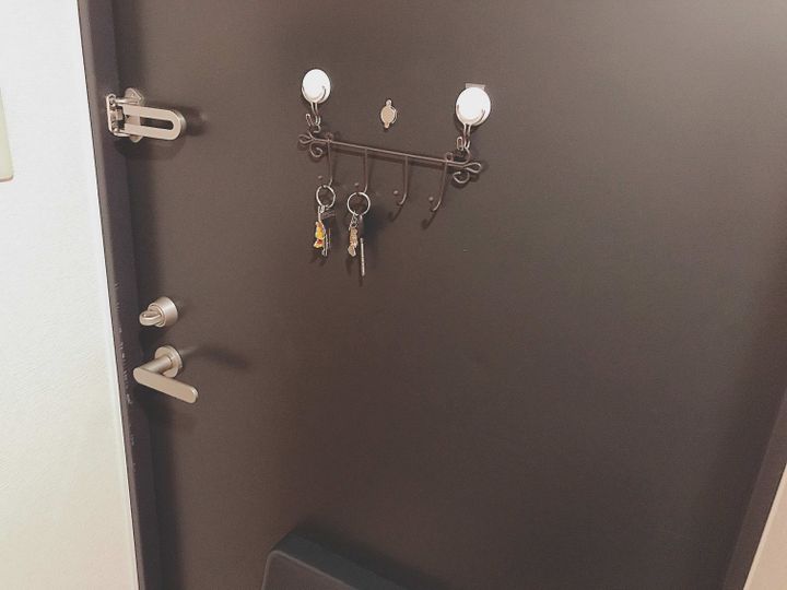 玄関ドアにフックを貼り付けて、鍵を掛けています。