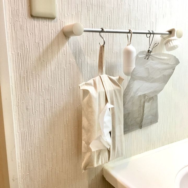 そこで我が家ではゴミ袋をワイヤークリップでタオルバーに引っ掛けています。それなりにゴミが溜まったら、袋ごと捨てるだけ。100均でよく見かける携帯ゴミ袋ケース(ロールタイプの袋が入っているキーホルダー)を一緒に掛けてあるので、すぐに新しいものと交換できます。