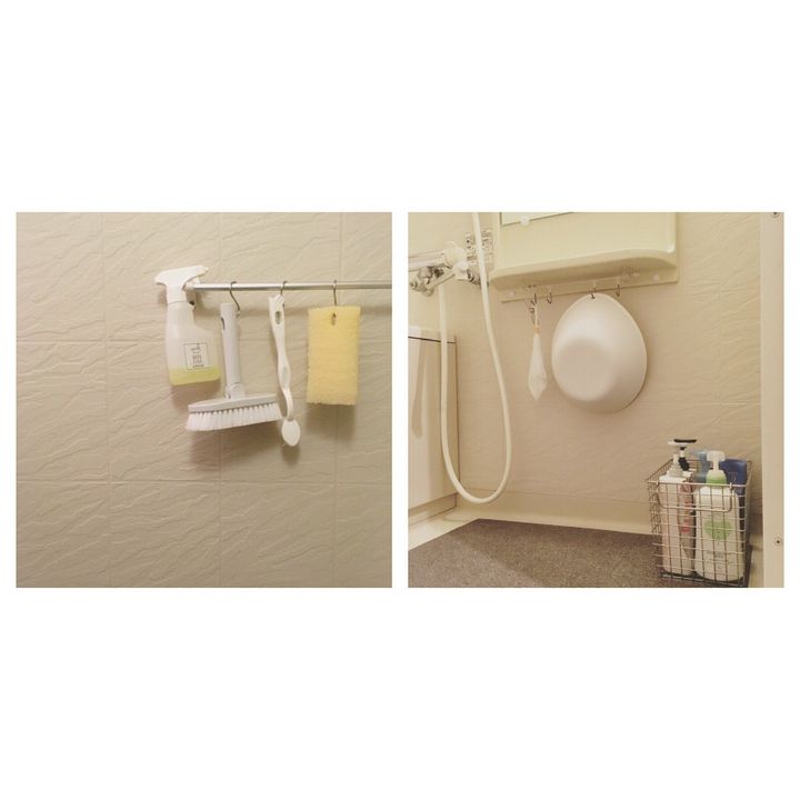 我が家では元々あるタオルバーの他に、唯一吸盤がつく棚の裏にもう1本タオルバーを付けています。片方には入浴中に使うものを、もう一方には掃除用品や靴ブラシを引っ掛けています。