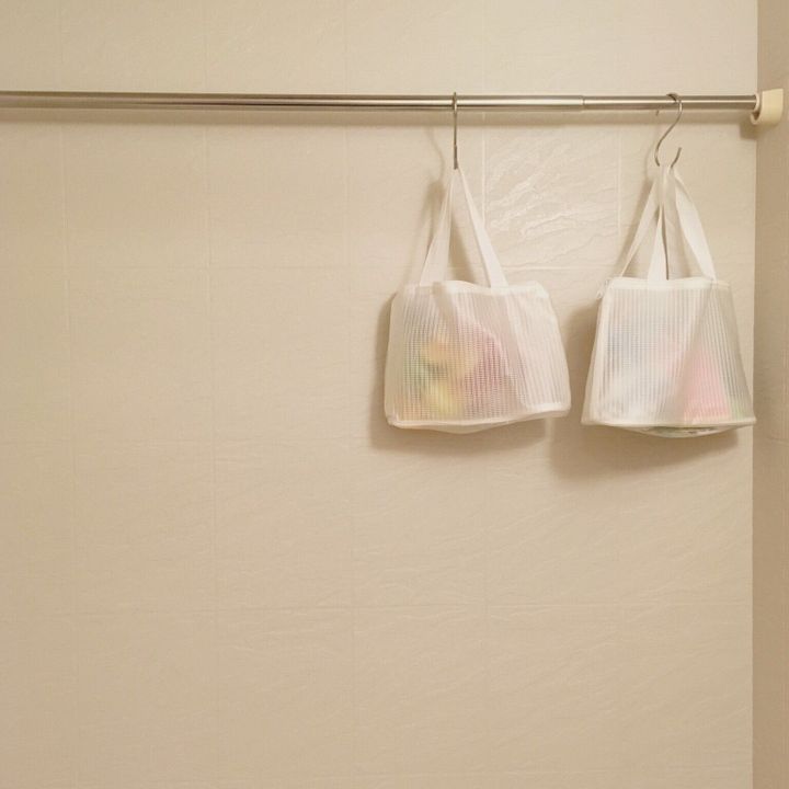 子ども達はまだまだお風呂でおもちゃが欠かせません。そこで我が家では、底がメッシュになっている100均のスパバッグに入れて、室内干し用のバーに引っ掛けています。