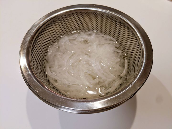 1.玉ねぎをスライスし水にさらして辛みを取っておく