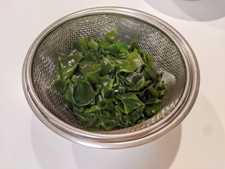 乾燥ワカメを使う場合は、出来上がり量が玉ねぎと同じくらいになるように、わかめを水で戻します。