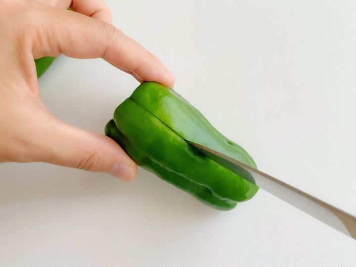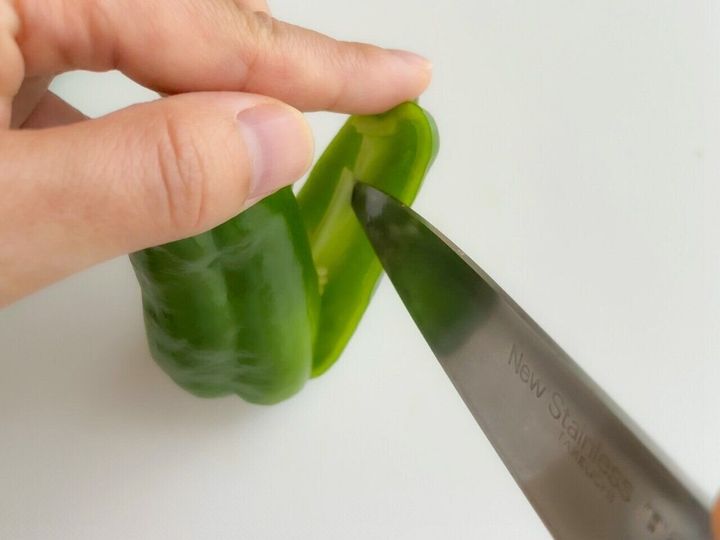 ピーマンを切る時には、まず半分にザクっと切ってから種をとるかたが多いかと思います。種をきれいにとるためには、包丁をいれる場所がポイントです。
