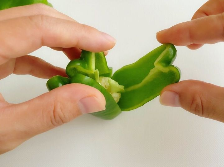 (3) おしりの切り込みの部分からピーマンをひらく。