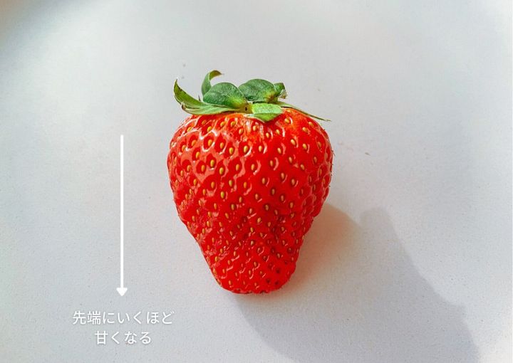いちごは先に熟しはじめる先端にいくほど甘みが強く、ヘタに近い方が酸っぱく感じます。