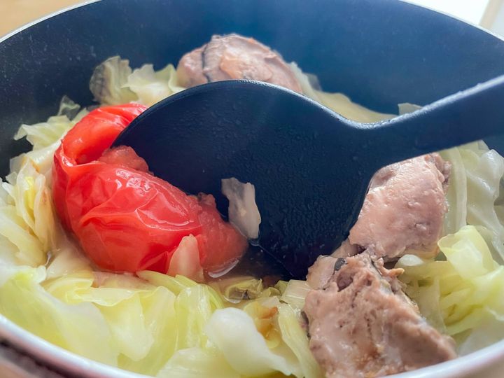 今回ご紹介するカレーは、キャベツ・トマト・鯖缶を具材で使用します。キャベツは手でちぎり、トマトは加熱するとヘラでほぐすことができます。鯖缶は加熱済みなので、煮込んで火を通す必要もなし。