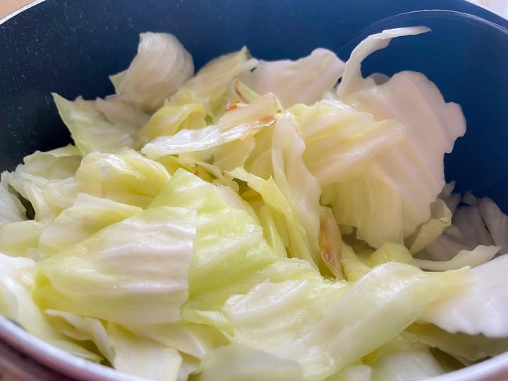 (1) 鍋に油を熱し、手で食べやすい大きさにちぎったキャベツをかるく炒める。