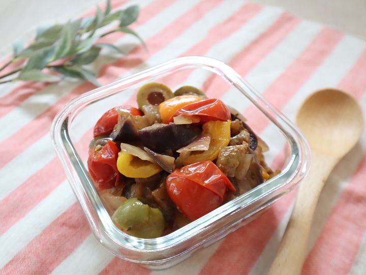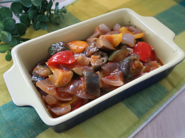 ズッキーニ、ナス、たまねぎ、パプリカなどの野菜をトマトソースで炒め煮にします。