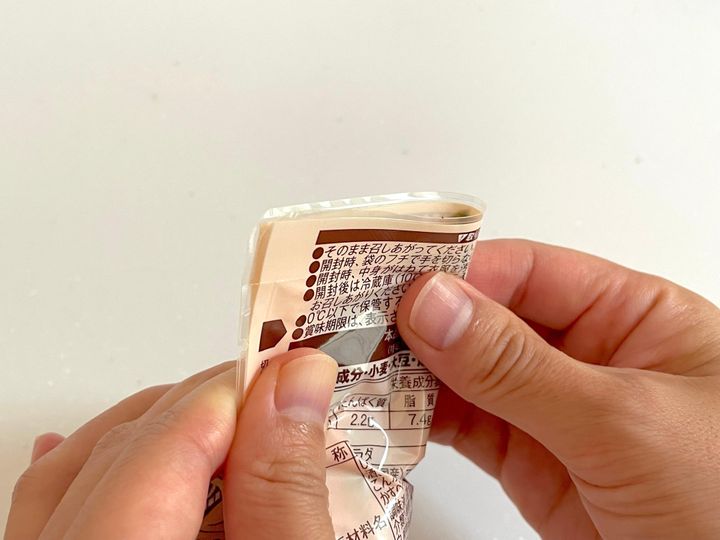 (2) パウチが重なったまま、通常の要領で切り口から開けていきます。