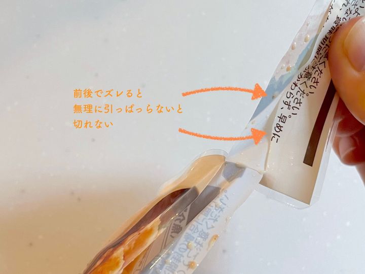 パウチの端にある切り口から普通に開けていくと、だいたい前後がズレて反対側の切り口にピッタリ到達することはないですよね。