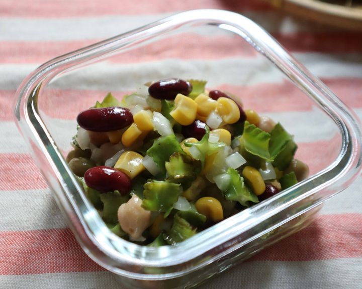 四角豆とミックスビーンズを合わせた、豆づくしのサラダ。コーンやたまねぎも加えて、彩りと食感をプラスします。四角豆は下茹でしたものを使いましょう。