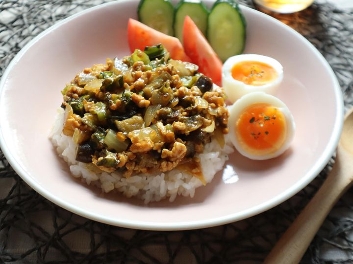 ダイスカットにした、四角豆・なす・ピーマン・たまねぎと鶏ひき肉でキーマカレーに。秋においしくなる四角豆となすに、ピーマンとたまねぎが加わり野菜たっぷりの仕上がりに。