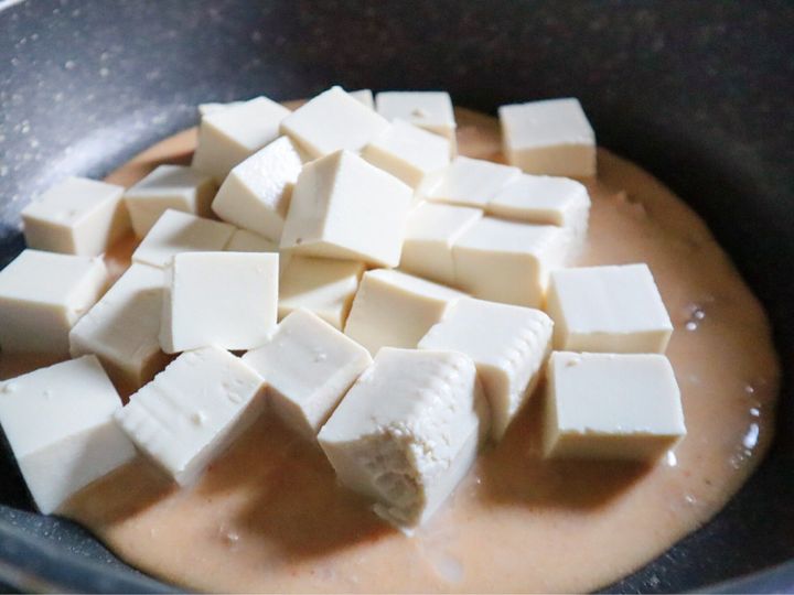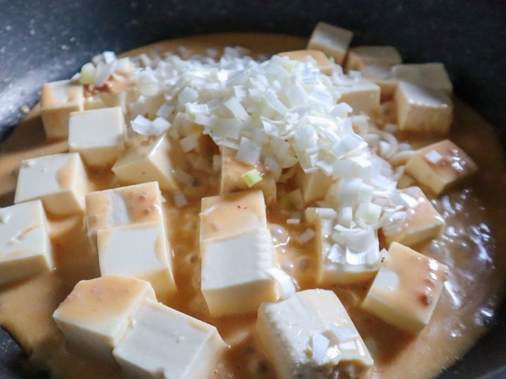 (1) フライパンに「調味ソース」と1.5cm角に切った豆腐を入れ、煮立たせる。(弱〜中火)
