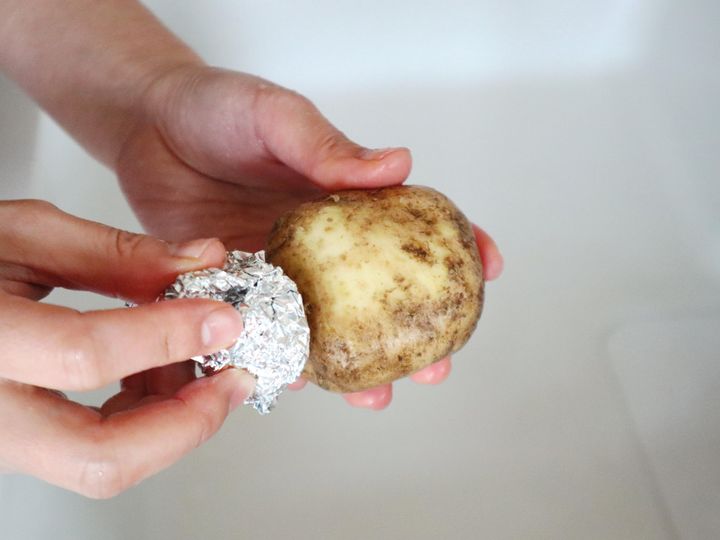 皮をむかずに作る料理では、土の洗い残しがないようにしたいですよね。特に、芽の周りは洗いにくいですが、アルミホイルの凸凹を押し当ててこすると、洗いやすくなります。