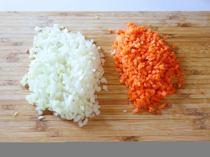 (2) 鍋にサラダ油を熱し、たまねぎとにんじんを炒める。
