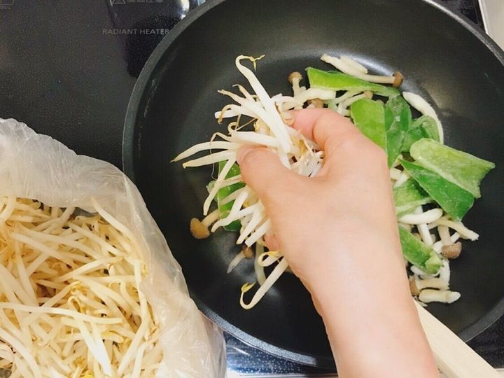 (1) フライパンにしめじ、ピーマン、もやしを冷凍のまま入れる。