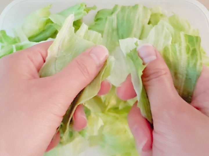我が家ではこの方法で、買ってきたレタスをすぐに食べやすいサイズにして大きなタッパーに保管しています。そうすることで、毎回洗って準備する手間もなくなるので、朝食のサラダやお肉料理の付け合わせなどに、パッと使うことができてとても便利です。