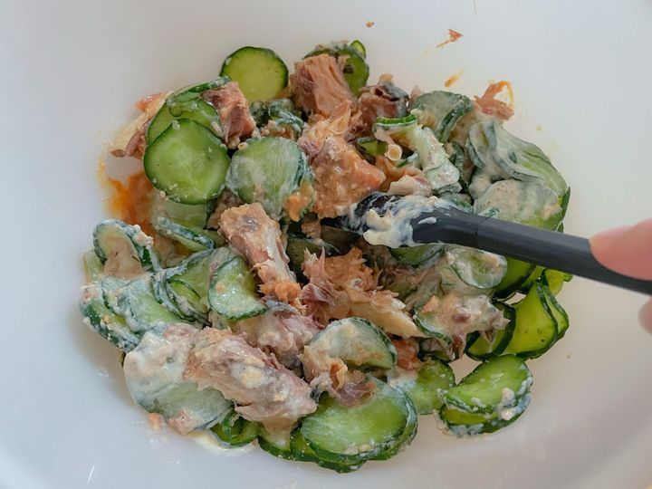 (3) ボウルに塩もみしたきゅうり、鯖、マヨネーズ、すりごまを入れる。