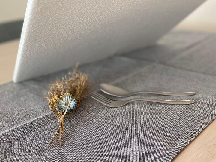 フォークに写っているのは、スタイリングで置いているドライフラワーの一部。室内の様子までは分かりませんよね。