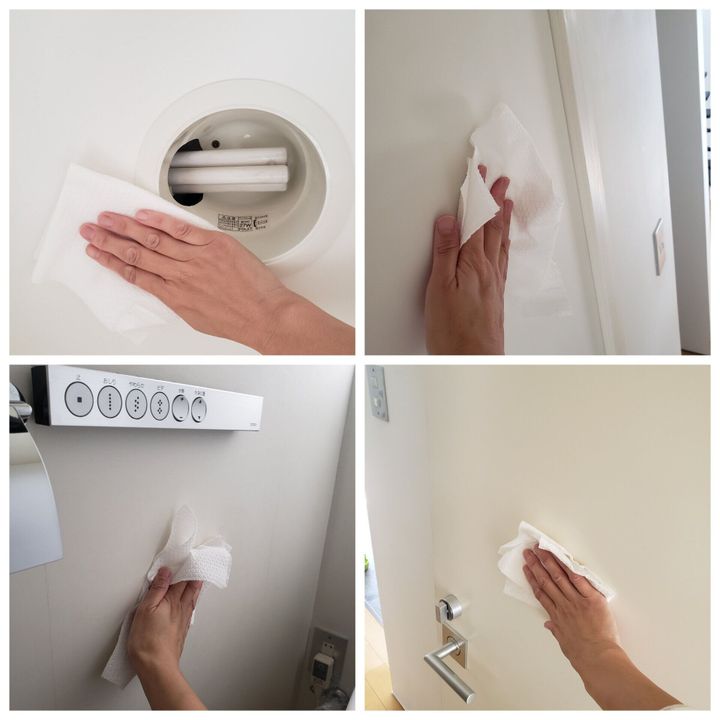 拭き掃除の基本は上から下へなので、天井から壁へと拭いていきます。