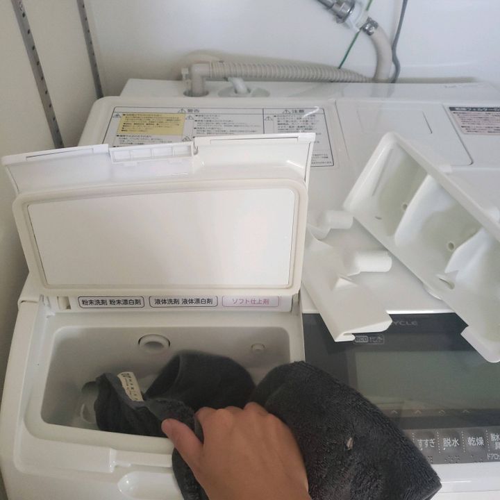 ドラム式なので、本体をサッと乾拭きし、洗剤投入口のパーツを外してサッと拭き、元に戻さず裏返して干しておきます。