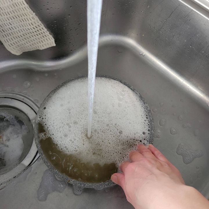 できたらお湯で洗うと短時間で済みます。これだけで9割は汚れが落ちているので、仕上げに私はあみたわしでくるくるっと2〜3回お湯で回し洗いします。