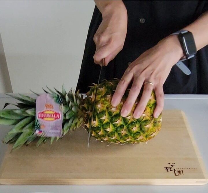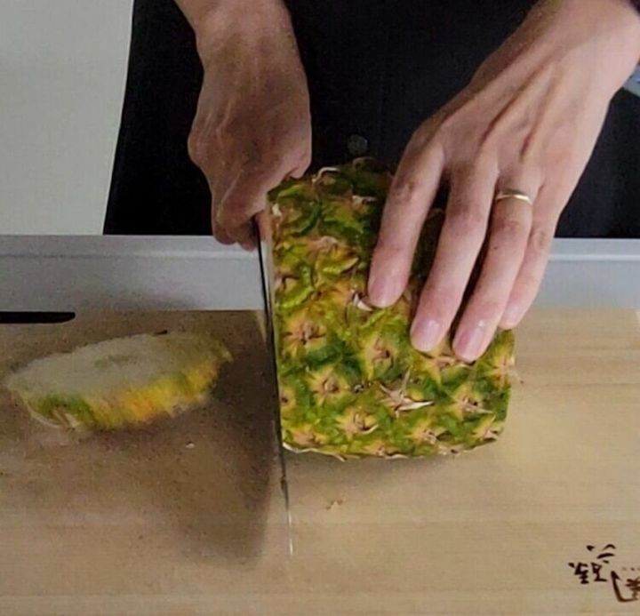 ちなみに、こちらはフィリピンパイナップルを使用していますが、今よく出回っている台湾パインは芯まで食べられるので、芯を取る必要がない分、更にカット数が減りもっと早く切ることができます。