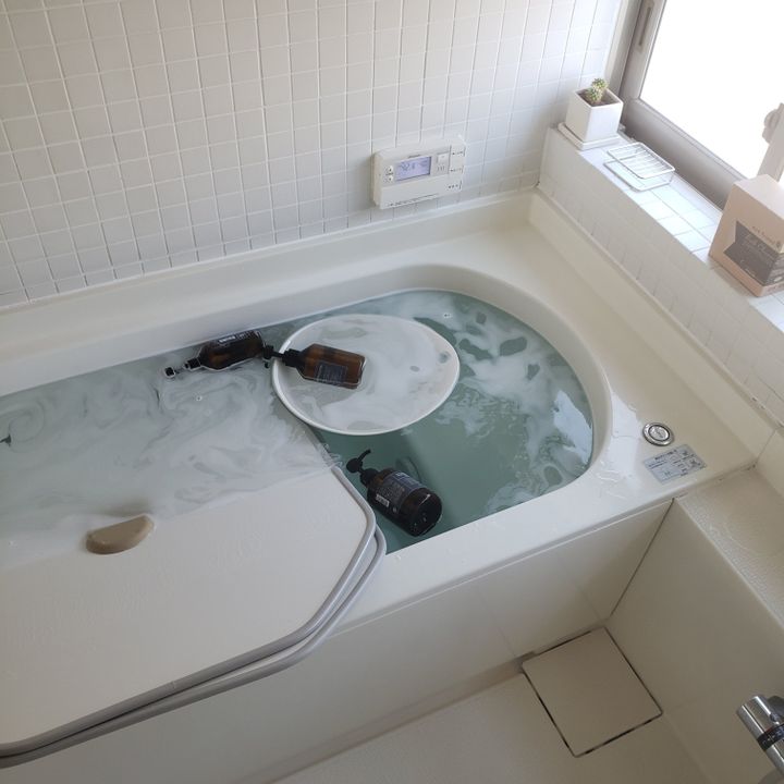 5分間程追い焚きをし、風呂備品を浴槽に浸け込んで8~10時間放置します。