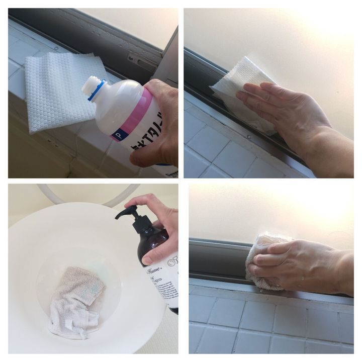結露で濡れてしまった窓を拭いてから、キッチンペーパーにエタノールを付けて拭きます。