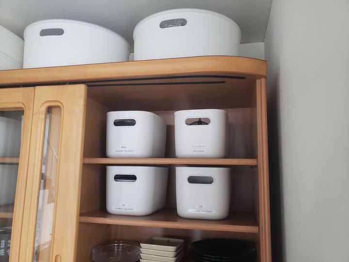 ここは私のこだわりみたいなもので、少しでも食器棚のごちゃつきを減らしたいため、収納ケースに入れてしまえばスッキリする!ただそれだけの事なんですが、上段のものを取り出しやすくもなっています。
