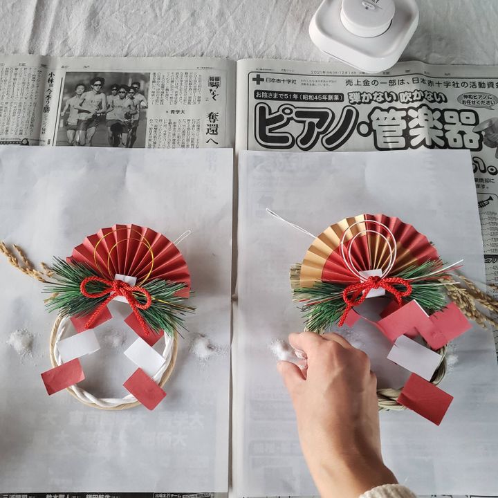 広げた新聞紙または白い布の上に正月飾りを乗せます。