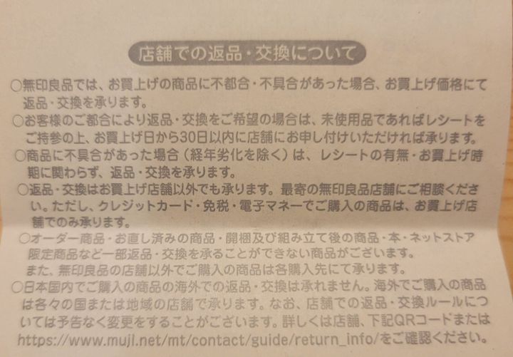 無印良品のレシートの裏には、店舗での返品交換について記載されているのはご存知でしょうか?