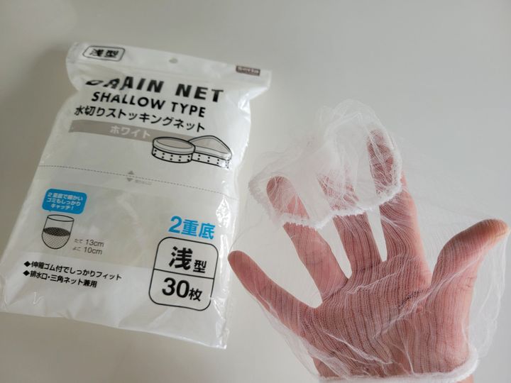 私が長年使っている水切りネットは、セリアの水切りストッキングネット。浅型2重底です。