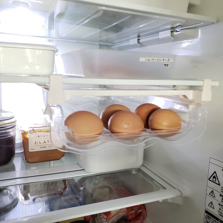 そこで私は棚と棚の間の空間がもったいないことに気付き、卵を浮かせ収納にしました。