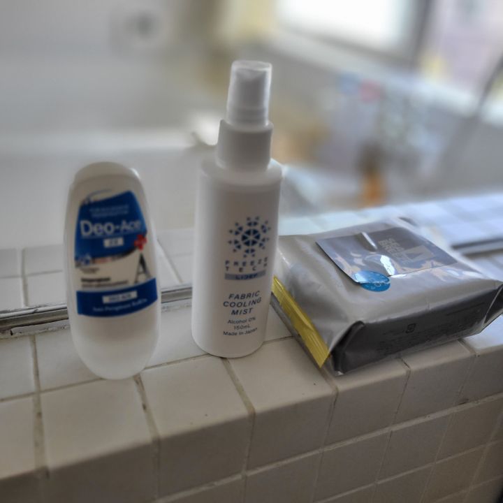 お風呂上がりに塗ってほしい制汗剤、汗をかいて着替える時にひと拭きして欲しいための汗ふきシート、服の上から吹きかけると冷んやりするスプレーを洗面所に出しっぱなしにすることにしました。