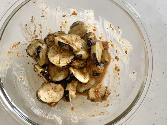 (1) 茄子は6mm厚の輪切りにし、しばらく水につけて灰汁を取る。ザルにあげて水けを切り、耐熱容器に広げて入れ600Wの電子レンジで5分半加熱する。