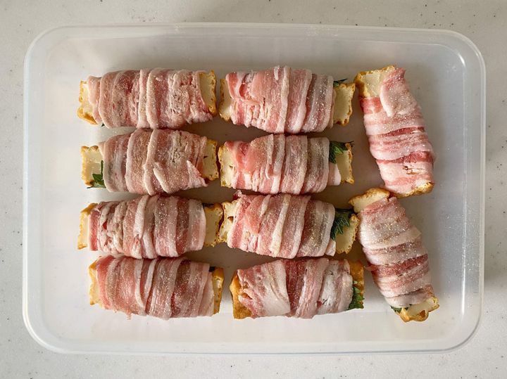 今回、厚揚げは8cm四方のものを2枚使用しています。この大きさなら、5等分で約1.5cm幅になるのでおすすめです。またチーズはQBBベビーチーズのような小分けの長方形タイプを使用すると、3等分しやすいです。