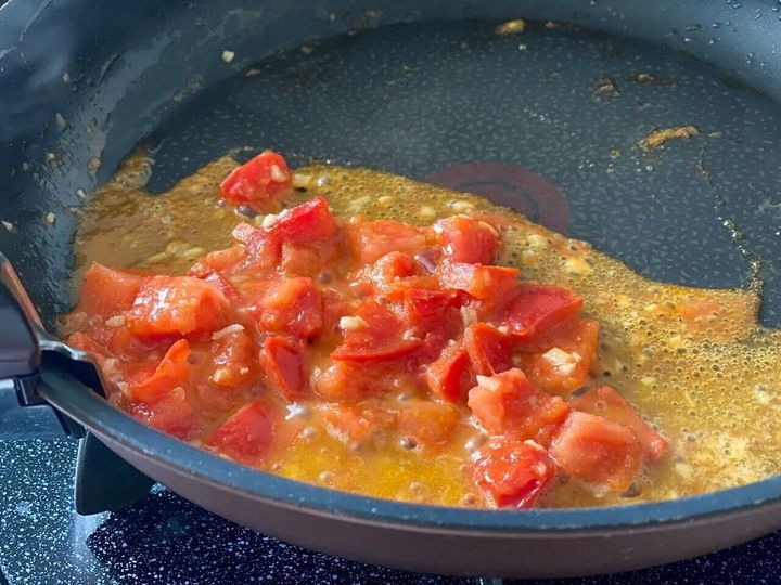 (3) 空いたフライパンに残りのオリーブ油を足し、にんにくを炒める。香がたってきたらトマトを入れ、1分ほど炒めたらAを加える。しっかり煮立たせ、とろみがついてきたら火を止める。