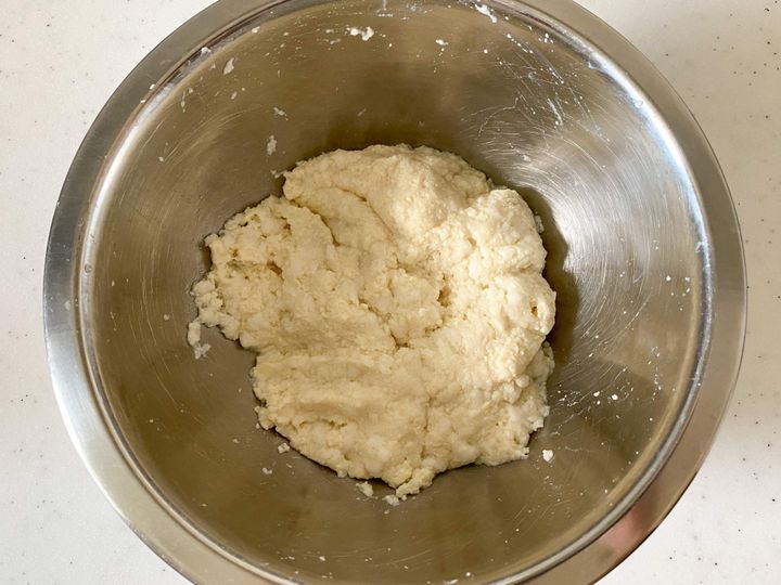 (2)ボウルに木綿豆腐とはんぺんを入れ、塩を加えてよく揉み込んで、均一にする。
