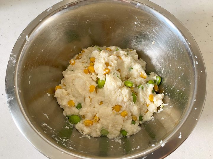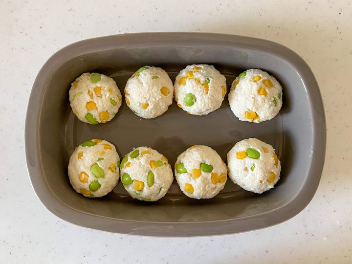 (3)コーン缶、枝豆、片栗粉を入れてさらに混ぜ、8等分にして丸めて耐熱皿に並べる。