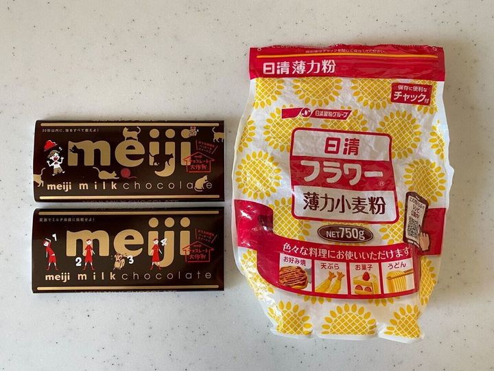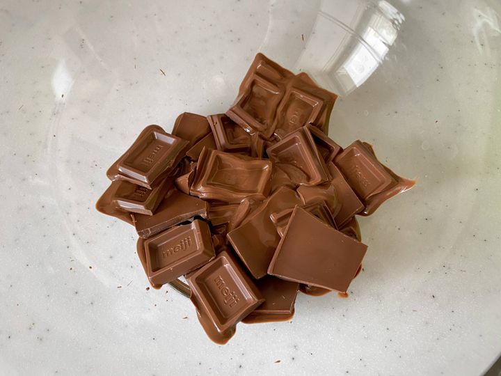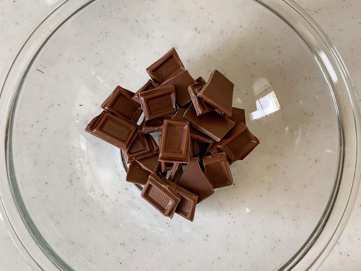 (1)板チョコは小さく割って耐熱ボウルにいれる。