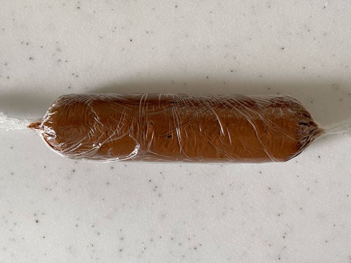 (4) (3)をラップに移し、棒状に伸ばしてラップに包む。